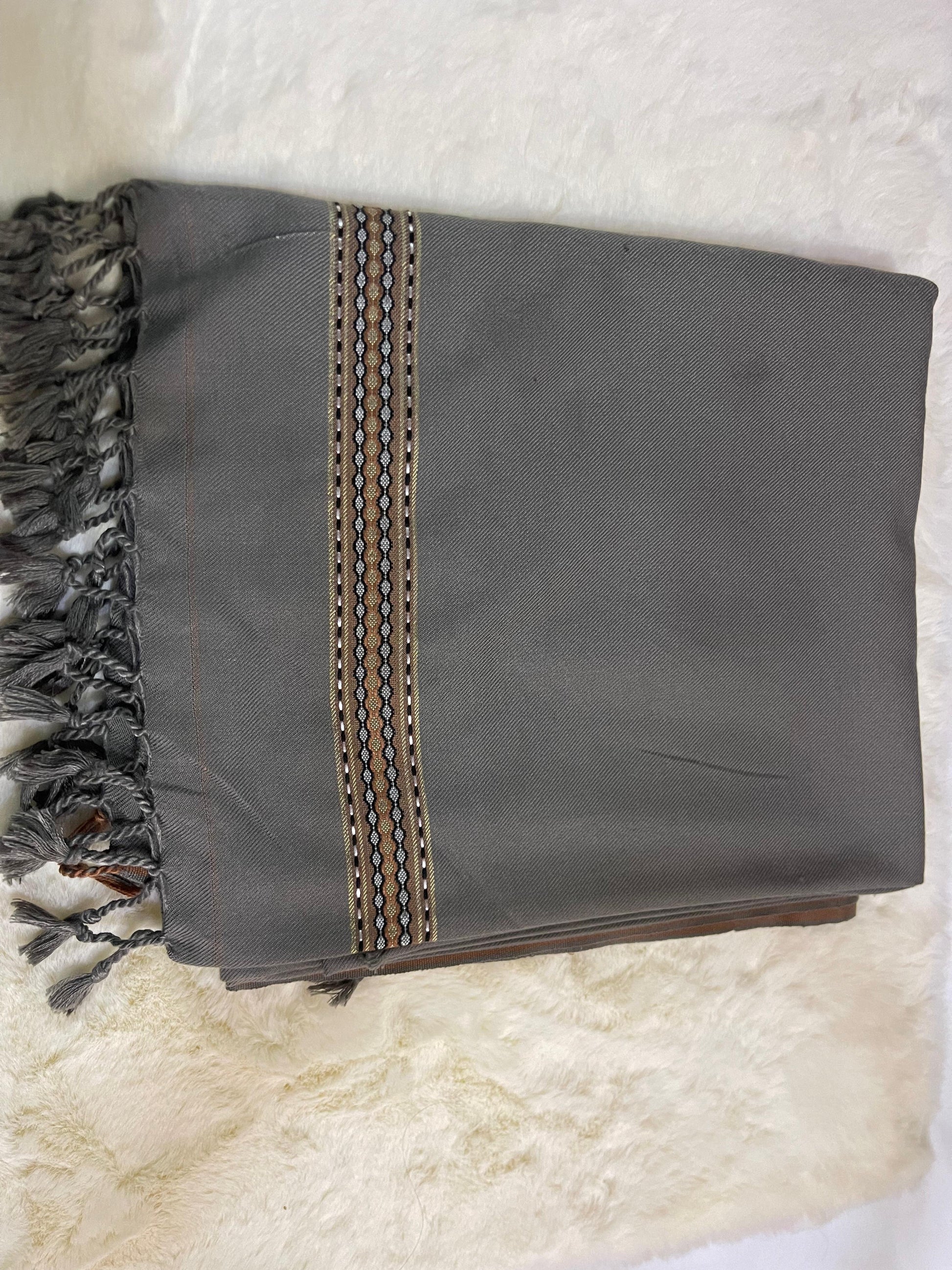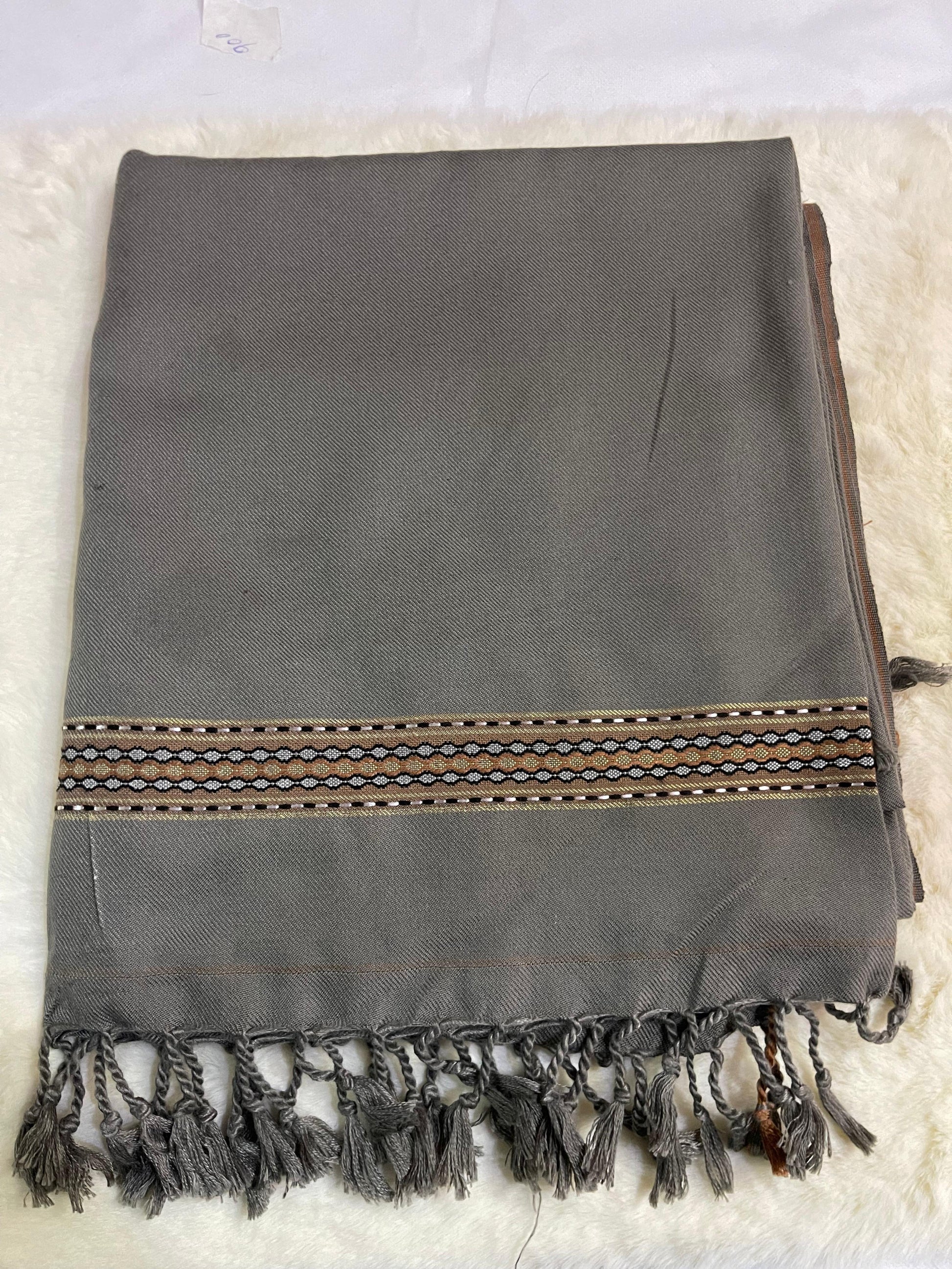 Introducing our stylish Grey Shaal for men. Made with high-quality pastel grey wool, this shawl is perfect for adding a touch of sophistication to any outfit. Featuring a decorative border, it is both functional and fashionable. Stay warm and elevate your style with our Grey Shaal.