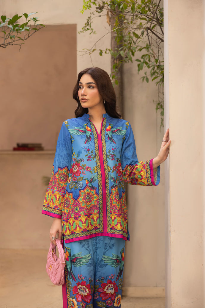 Make waves in OceanAra, a striking co-ord set that blends oceanic cool tones with bursts of vibrant florals and tropical bird motifs. The soft blue crepe silk base is elevated with bold yellow, pink, and red detailing, bringing movement and flair to every step. With a relaxed silhouette and rich, artistic print placement, this look is made for sunny escapes, resort brunches, or effortless day-to-evening transitions.