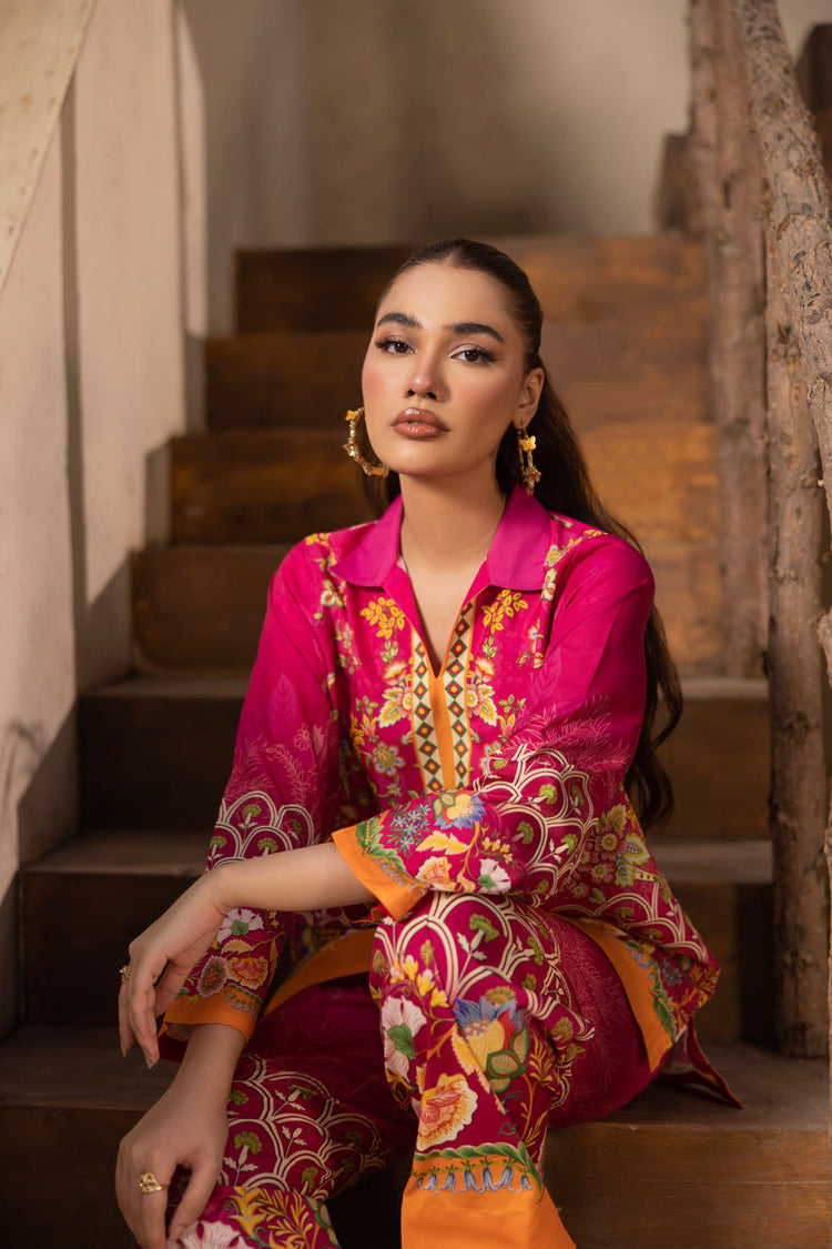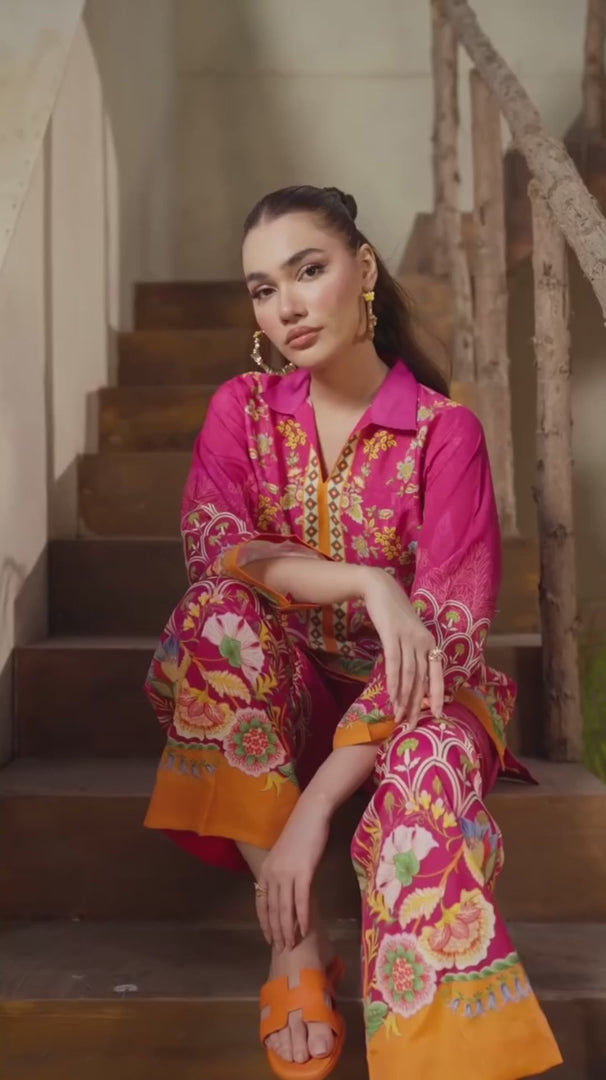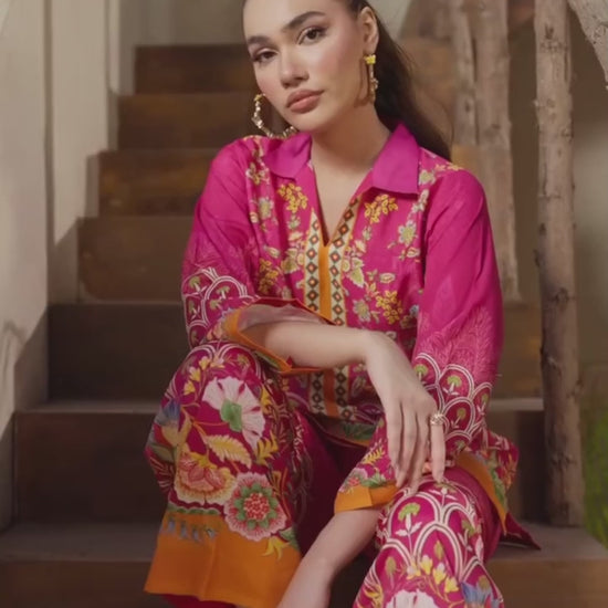 The short-length shirt and straight trousers are both adorned with a striking digital print featuring intricate floral and foliage patterns in an eye-catching palette of hot fuchsia pink and rich marigold orange accents. With its relaxed fit and captivating design, this set is perfect for stylish casual wear, festive gatherings, or a cheerful daytime look.